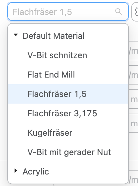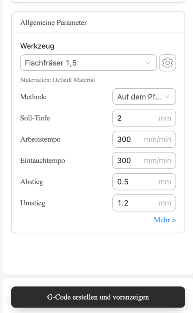 In diesem Menü kannst Du die Dicke des Werkstücks definieren und auch, welchen Fräskopf Du verwenden möchtest.